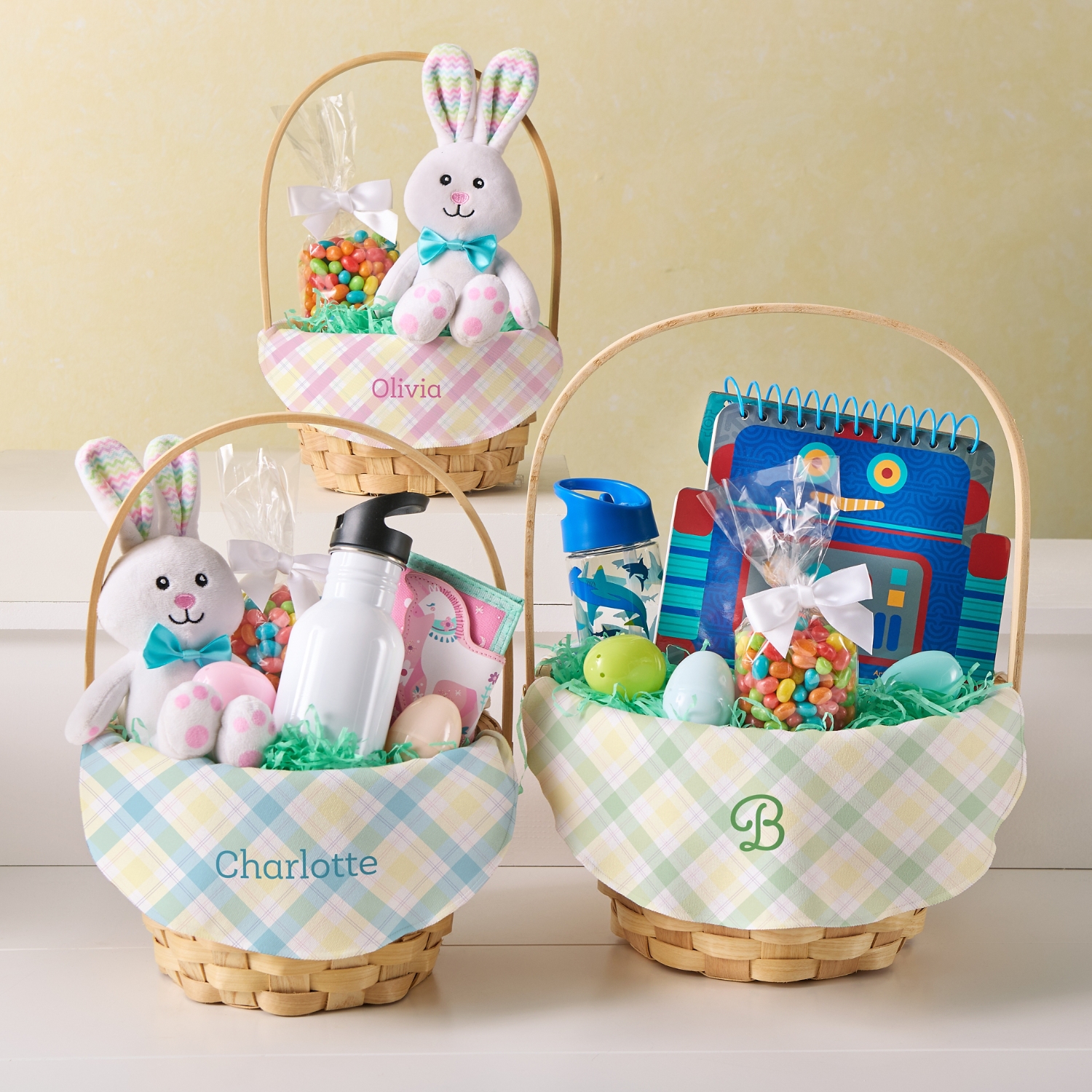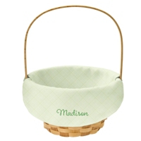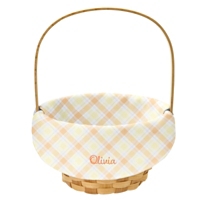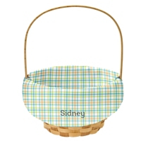 Product DescriptionAdd a festive touch to Easter with these cheerful baskets. Made of classic wood wicker, their bright plaid personalized liners brings playful charm to egg hunts and springtime treats.