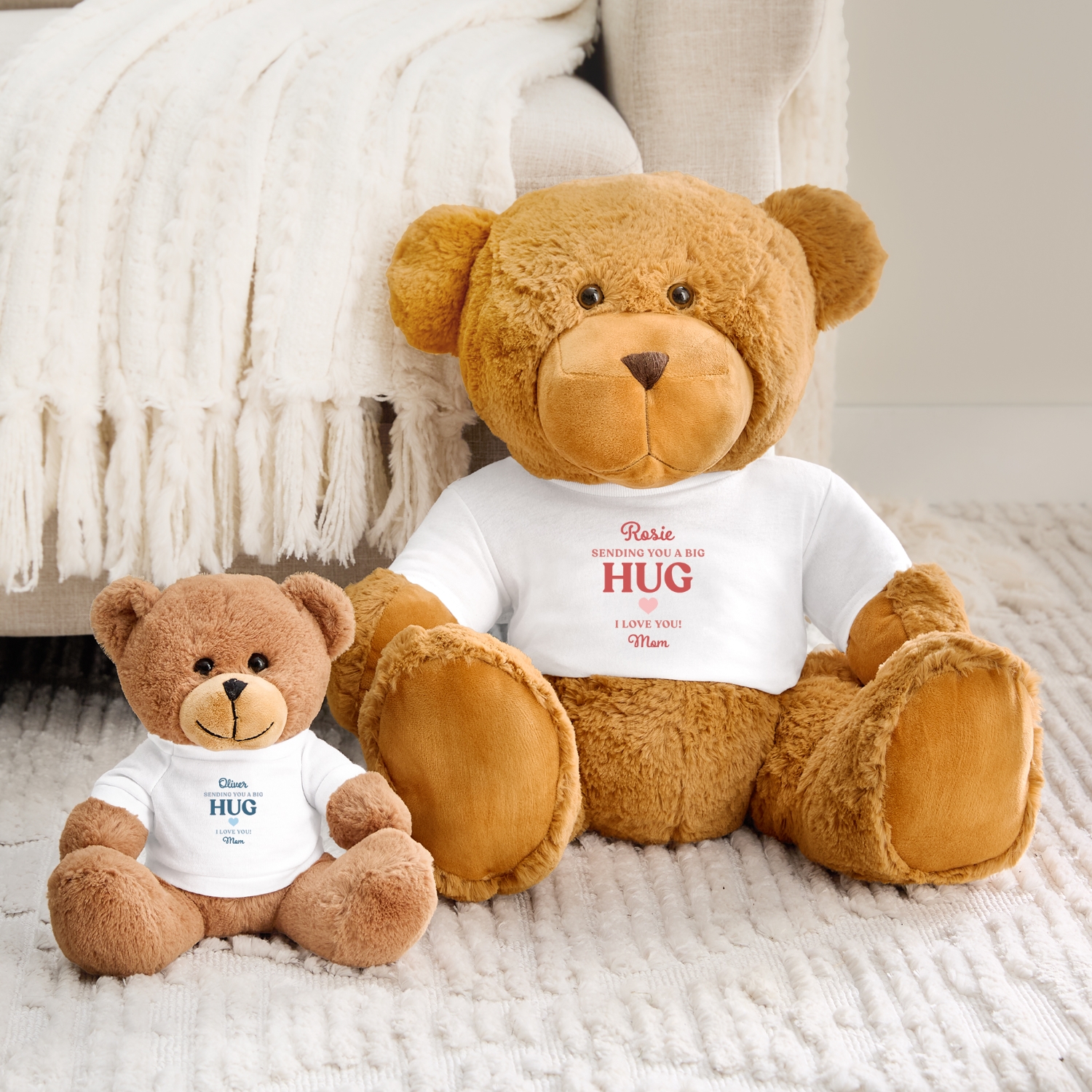 Product DescriptionThis cuddly friend wears a personalized T-shirt that says, “Sending You a Big Hug! I Love You!” With arms always ready for a squeeze and a smile that never fades, this teddy bear takes hugging very seriously.