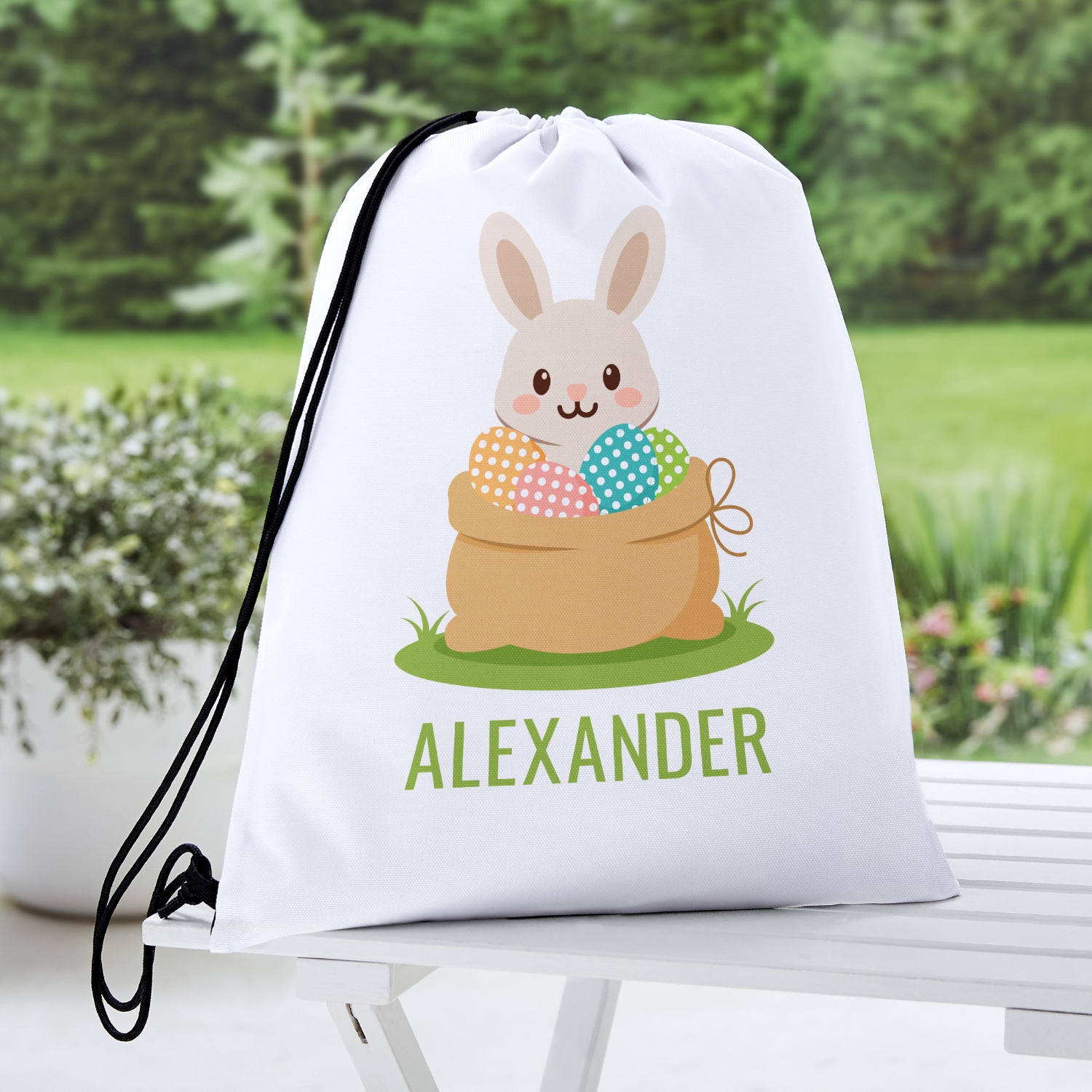 Product DescriptionCelebrate spring with this cheerful drawstring bag. Featuring a playful bunny and colorful eggs, it’s ready to carry your goodies in style.